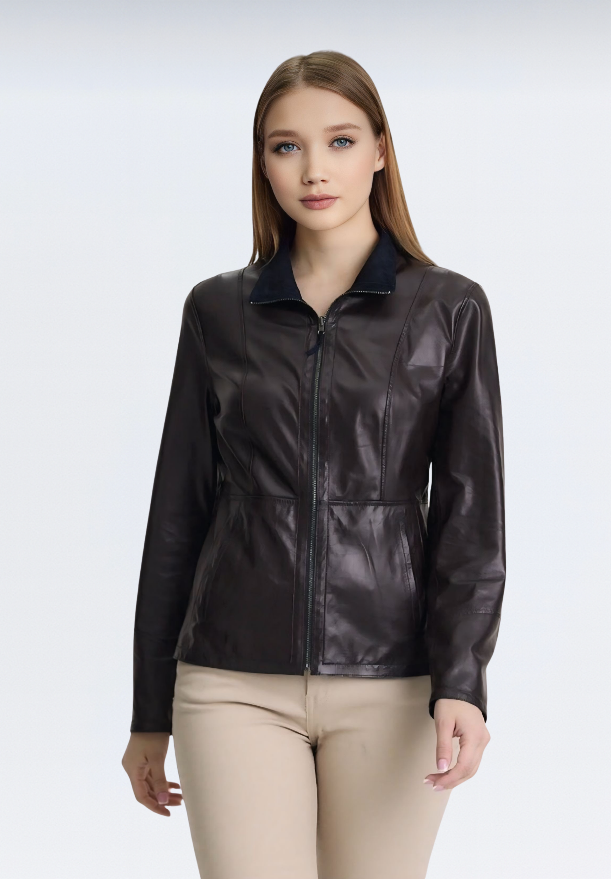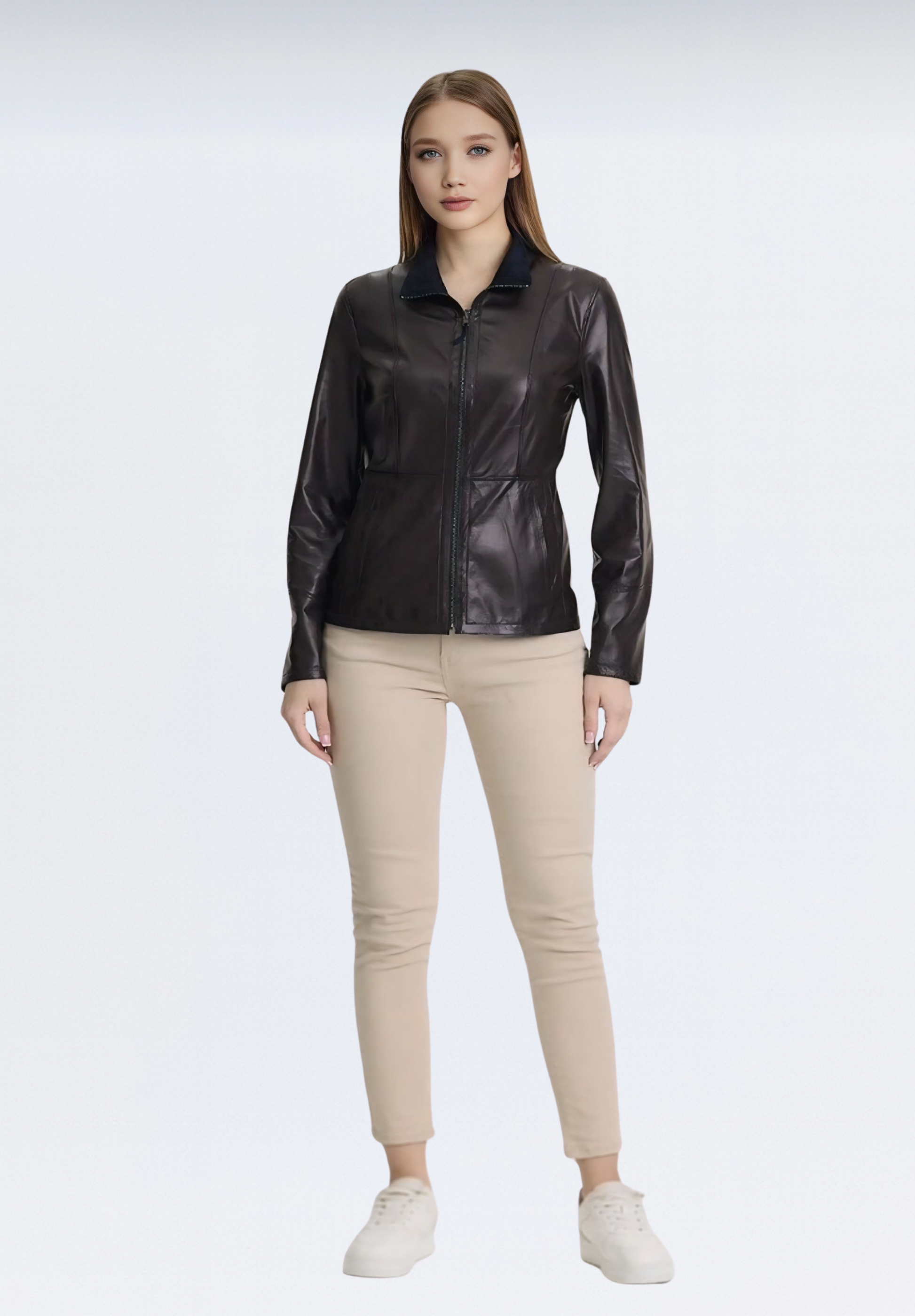 Ceketimiz iki yüzeyde de şıklık sunacak şekilde özel olarak tasarlanmıştır. Bir yüzü klasik deri parlaklığına sahipken, diğer yüzü doğal süet dokudadır. Fermuar ve etiket detayları da her iki yöne uygun olarak yerleştirilmiştir.