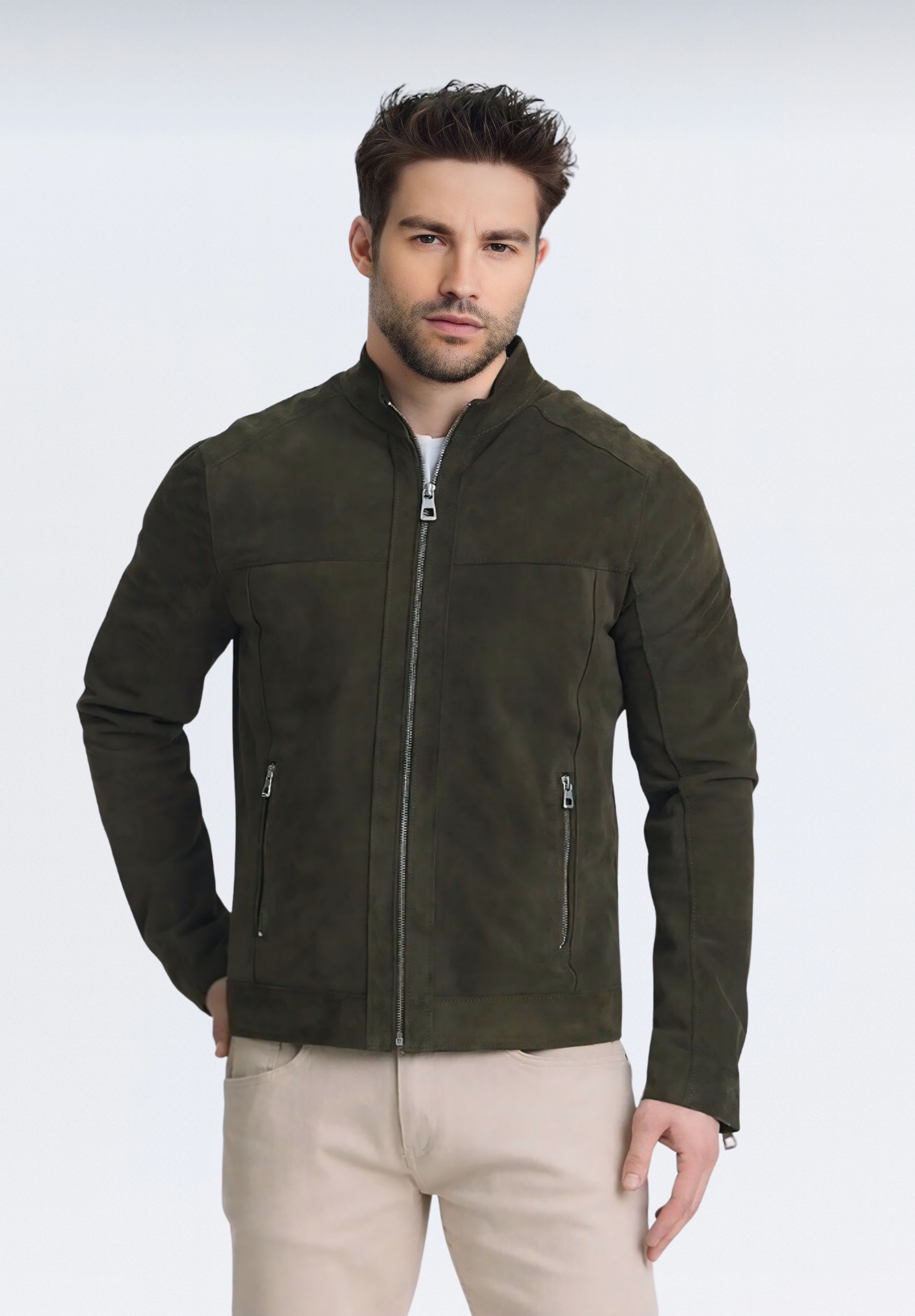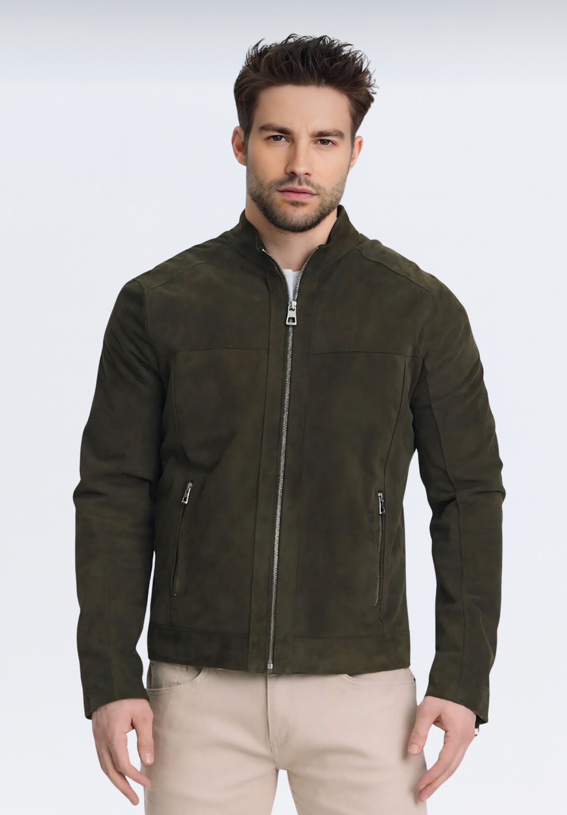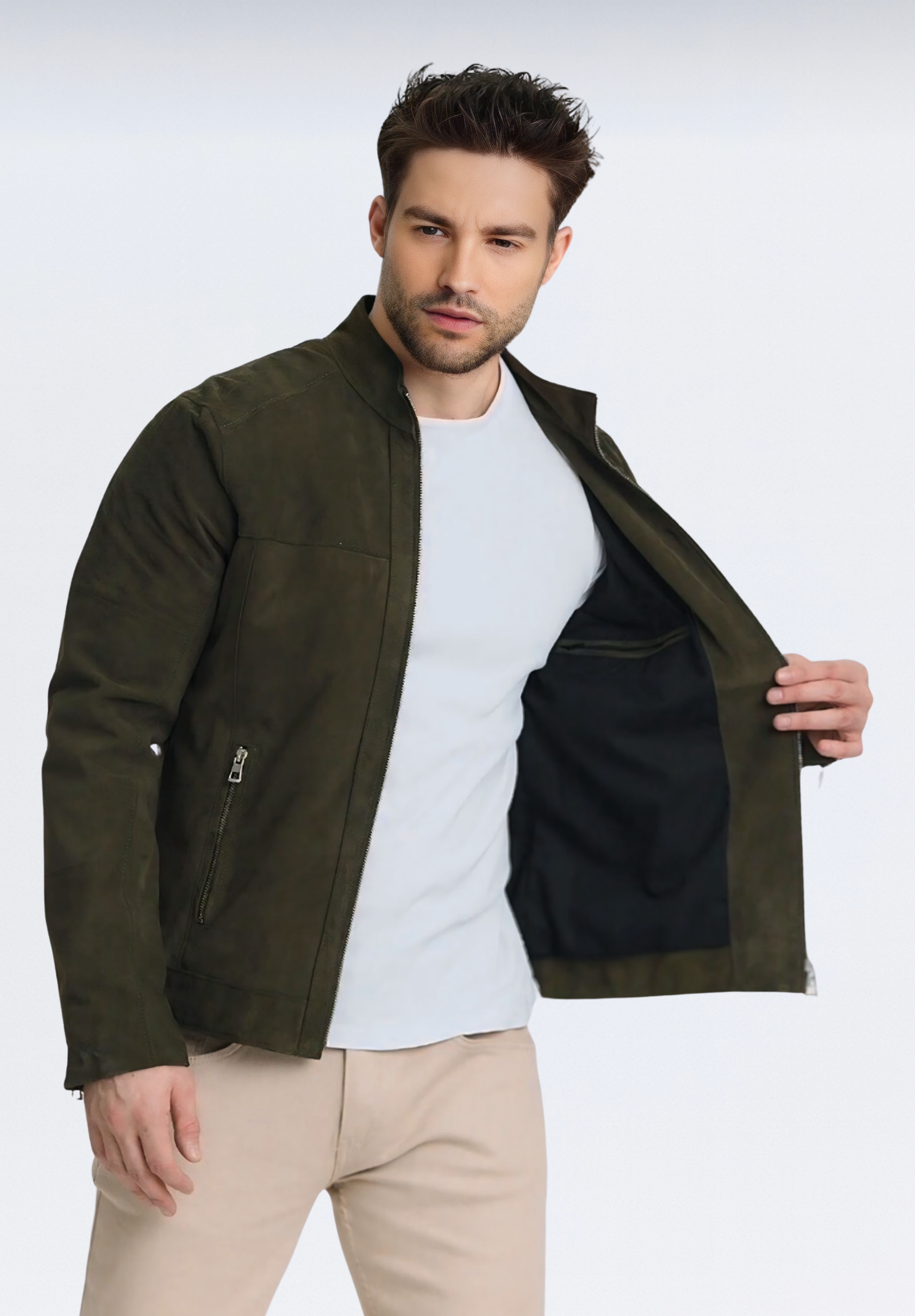 Bu özel tasarım ceket, %100 hakiki oğlak derisinden üretilmiştir ve dış yüzeyinde doğal süet dokusu kullanılmıştır. Oğlak derisinin yumuşak ve hafif yapısı sayesinde gün boyu konfor sunarken, süet yüzey cekete zarif ve sofistike bir görünüm kazandırır.