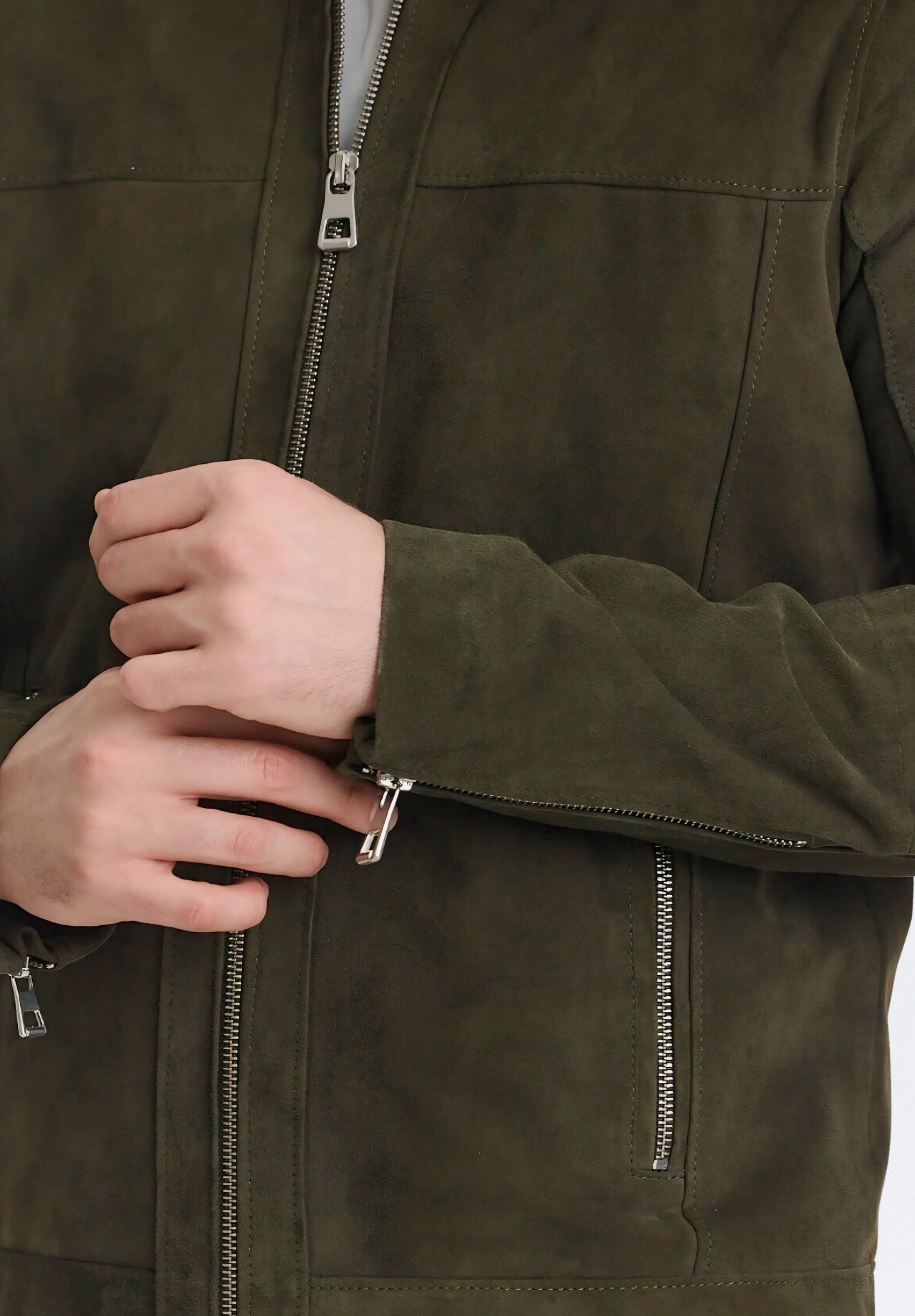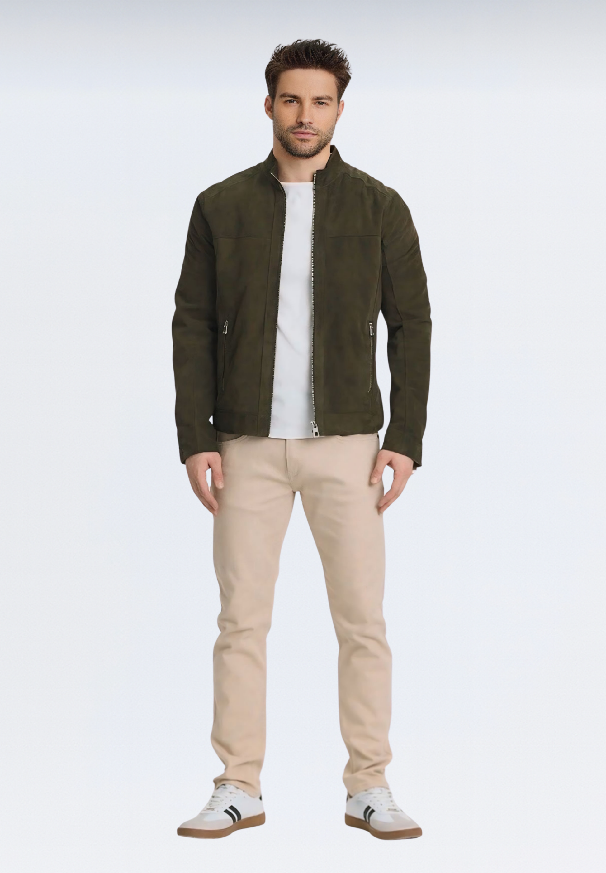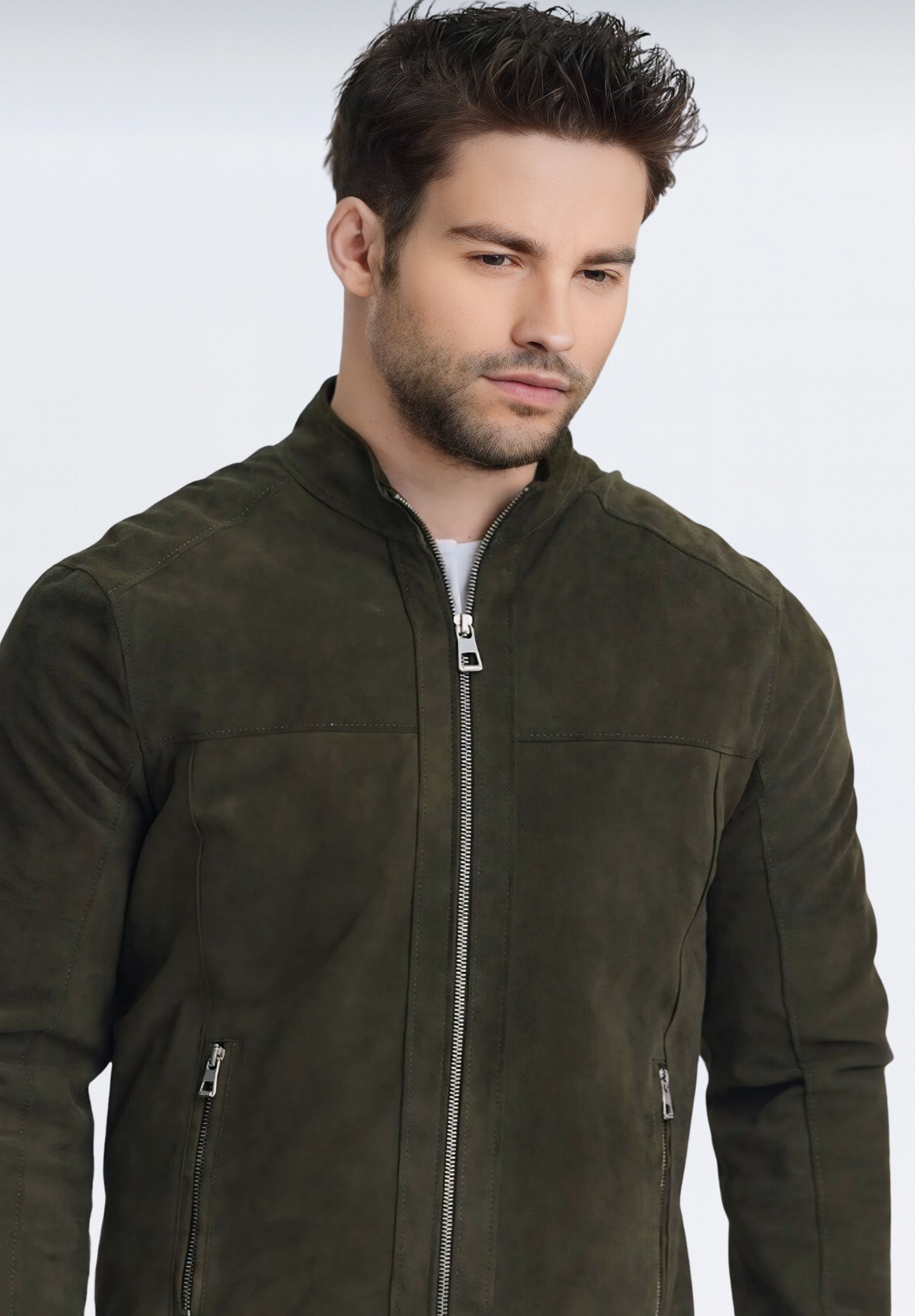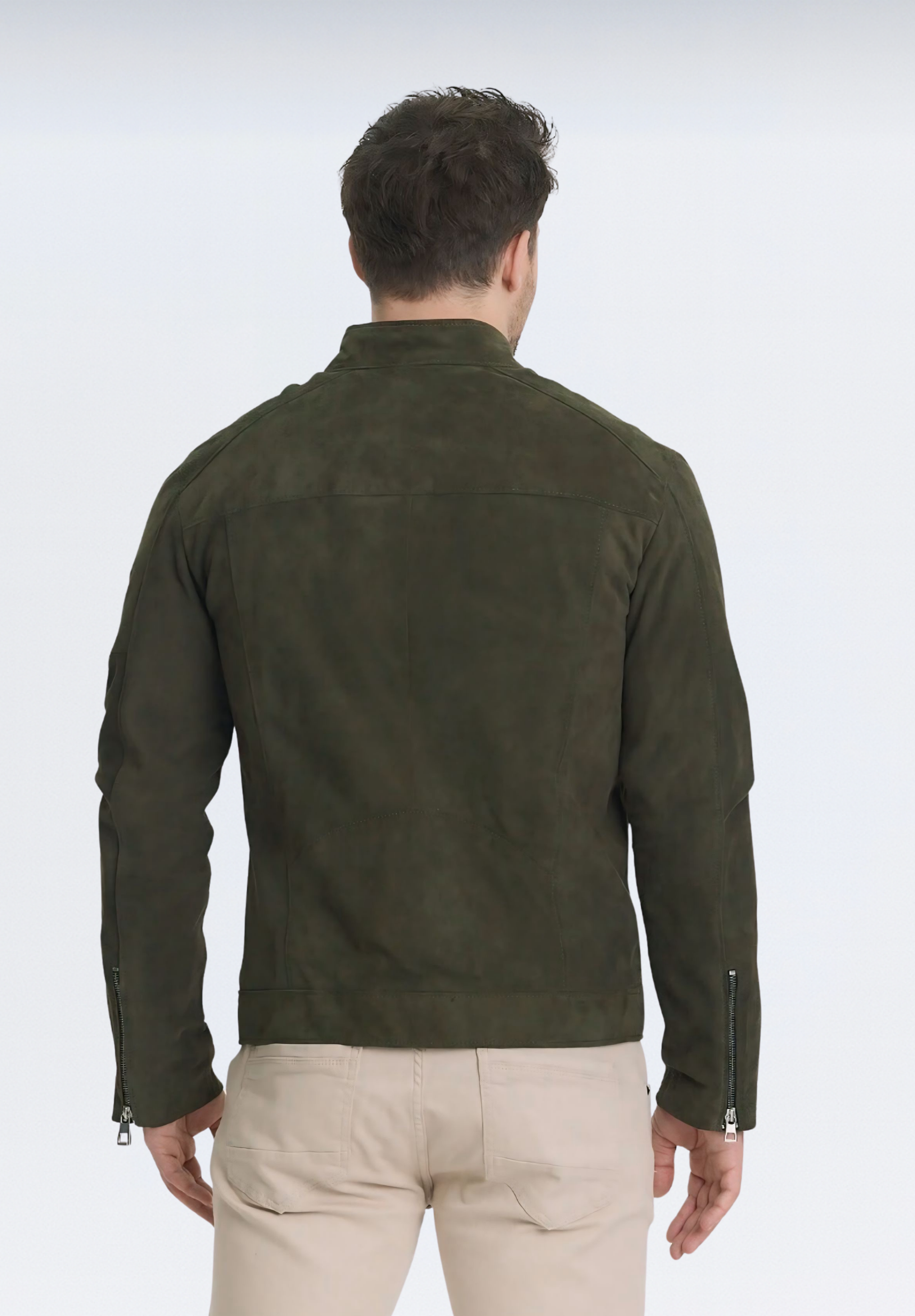 Bu özel tasarım ceket, %100 hakiki oğlak derisinden üretilmiştir ve dış yüzeyinde doğal süet dokusu kullanılmıştır. Oğlak derisinin yumuşak ve hafif yapısı sayesinde gün boyu konfor sunarken, süet yüzey cekete zarif ve sofistike bir görünüm kazandırır.
