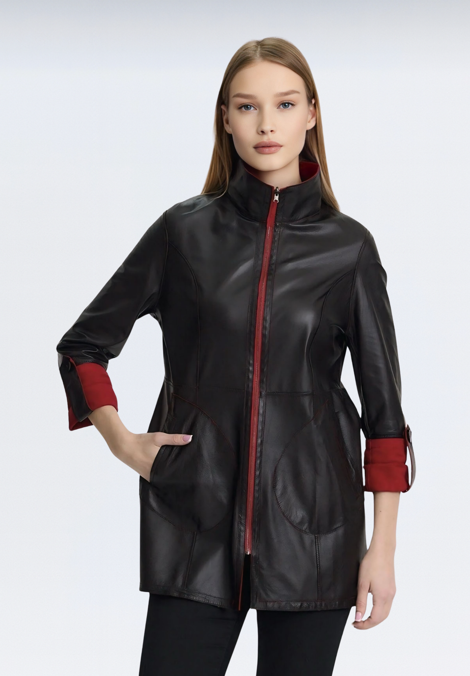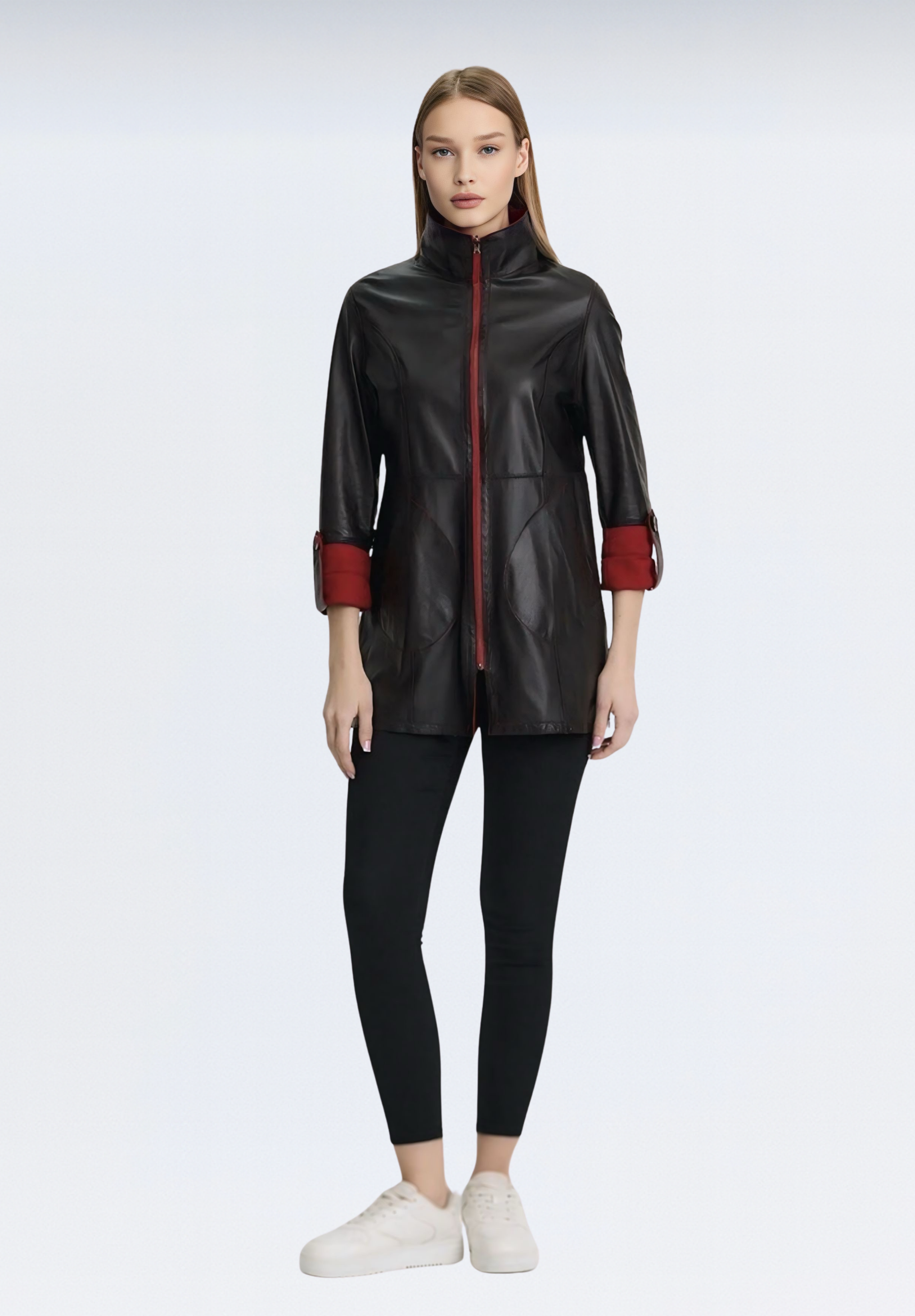 Ceketimiz iki yüzeyde de şıklık sunacak şekilde özel olarak tasarlanmıştır. Bir yüzü klasik deri parlaklığına sahipken, diğer yüzü doğal süet dokudadır. Fermuar ve etiket detayları da her iki yöne uygun olarak yerleştirilmiştir.