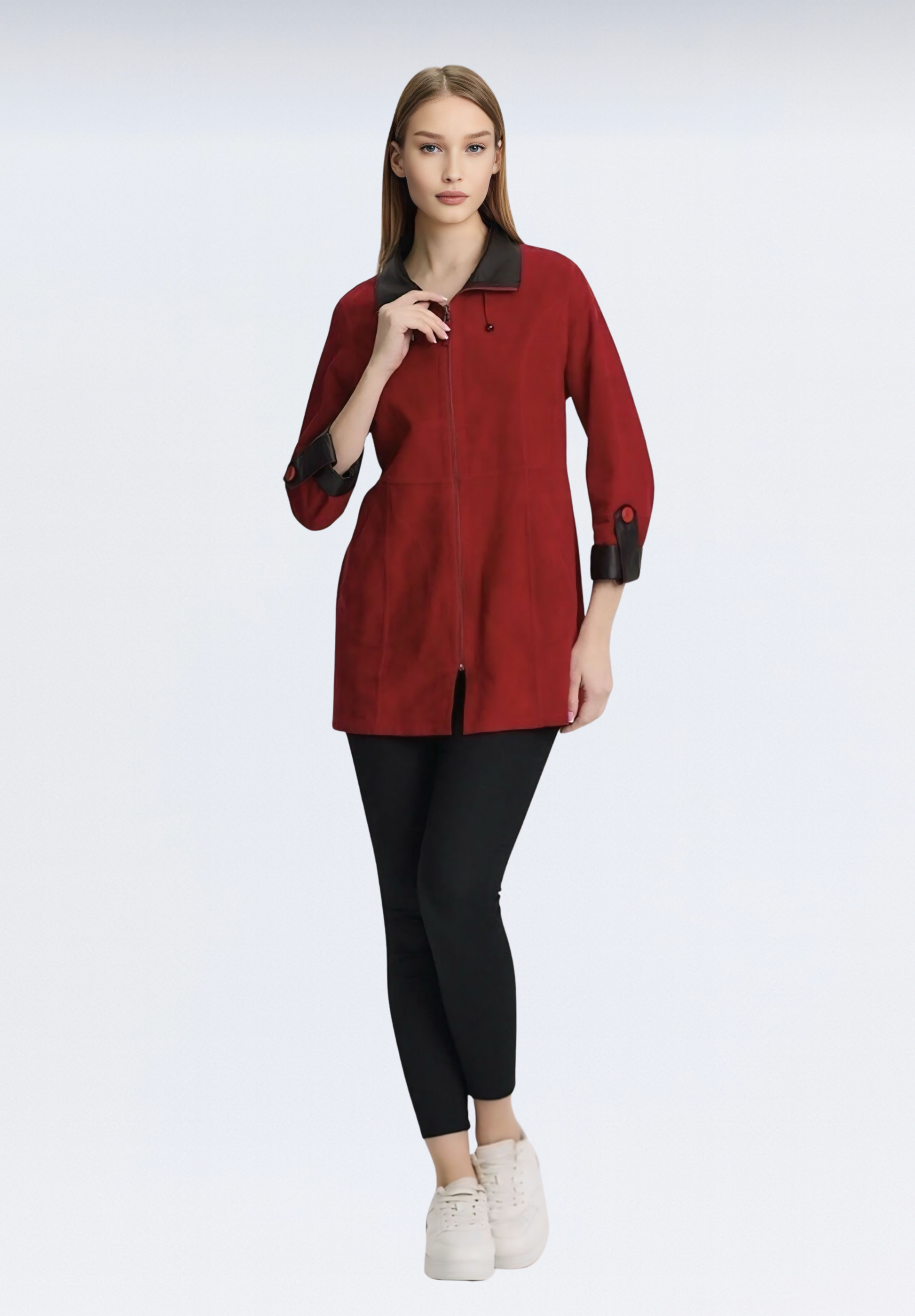 Bu özel tasarım ceket, %100 hakiki oğlak derisinden üretilmiştir ve çift taraflı kullanım özelliğiyle gardırobunuza fonksiyonellik katıyor. Yumuşak dokusu ve hafif yapısıyla gün boyu konfor sağlar. Doğal süet yüzeyi, zarif bir görünüm sunarken, nefes alabilir yapısı sayesinde cildinizle mükemmel uyum sağlar.