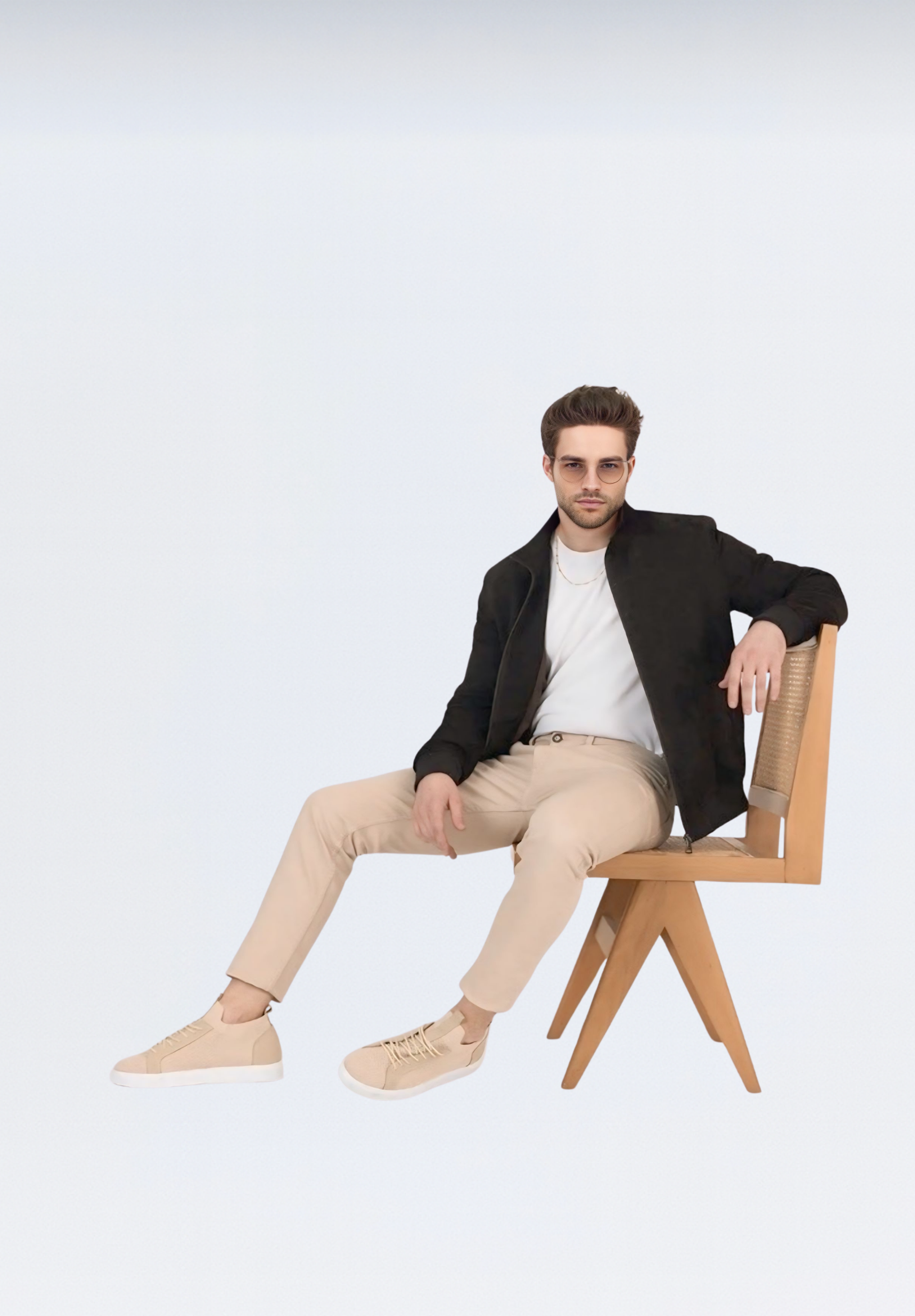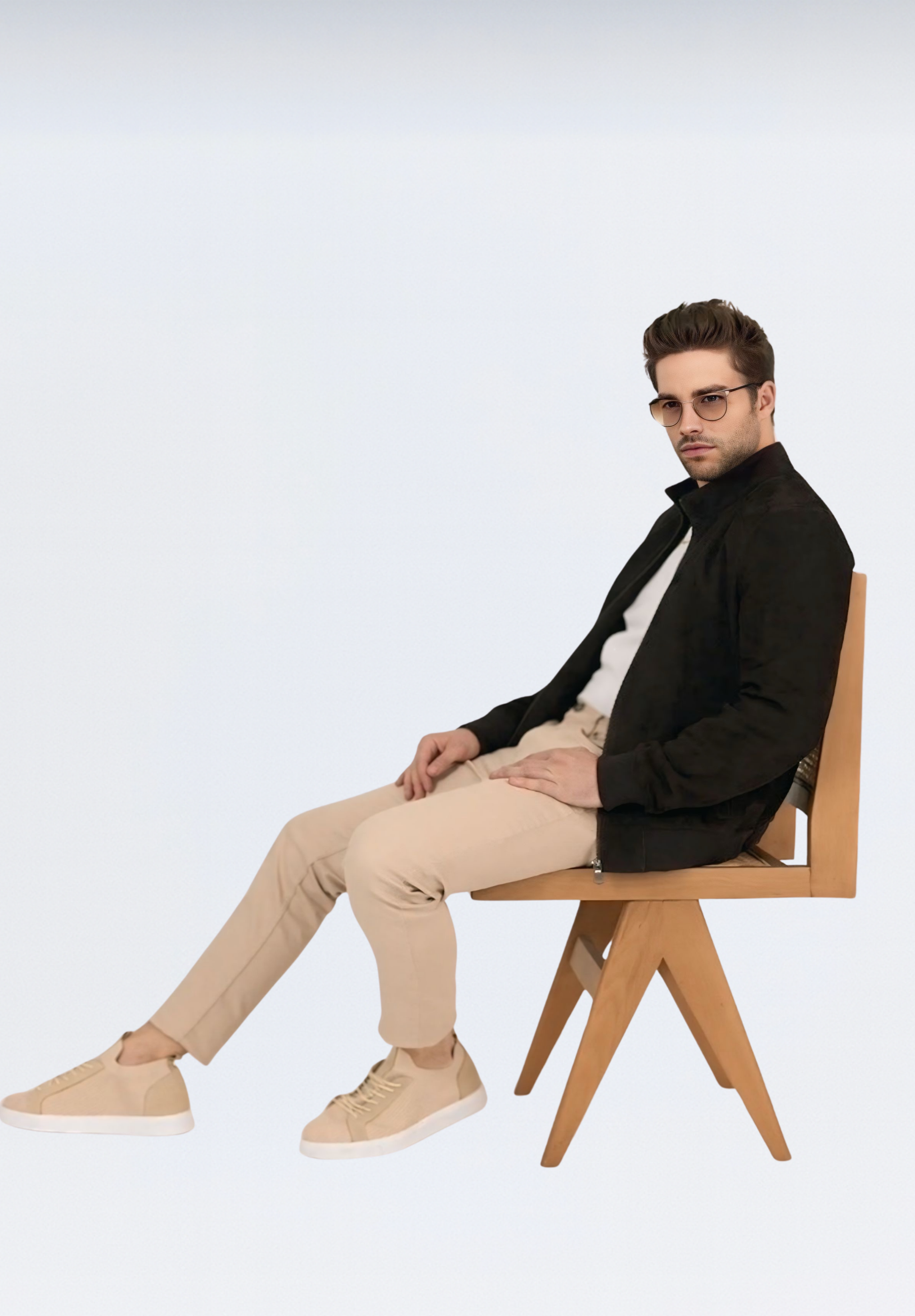 Bu özel tasarım ceket, %100 hakiki oğlak derisinden üretilmiştir ve dış yüzeyinde doğal süet dokusu kullanılmıştır. Oğlak derisinin yumuşak ve hafif yapısı sayesinde gün boyu konfor sunarken, süet yüzey cekete zarif ve sofistike bir görünüm kazandırır.